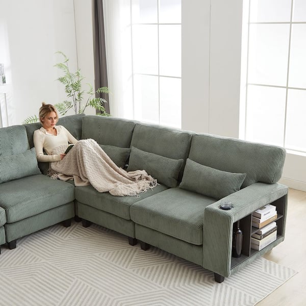 102.75 x 102.75 in. L-Shaped Modular Corduroy 5-Seat Convertible Sectional Sofa in Green with Arm Storage, Cup Holder