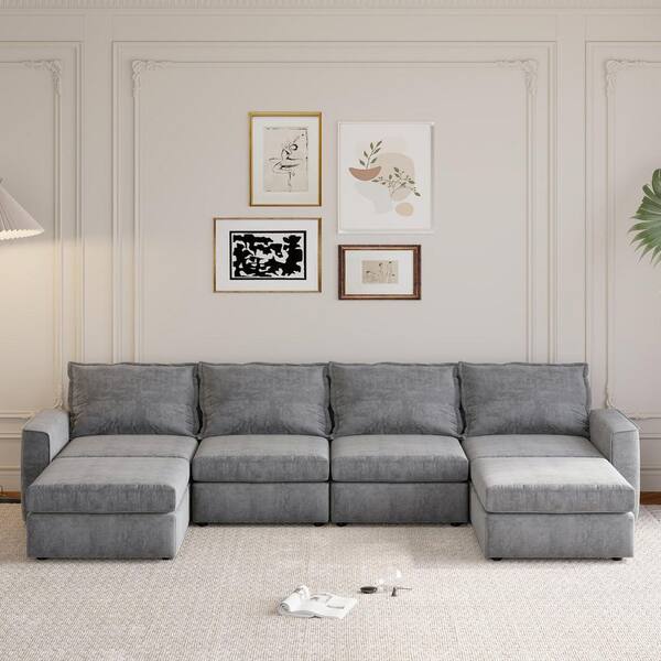 115 in. Chenille Modular U-Shaped 6-Seat Sectional Sofa Bed in. Gray with Ottoman, Convertible OversizedGray