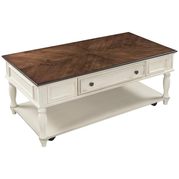 Antique White 2-Tone Retro Cocktail Table Coffee Table Easy Assembly Movable with Caster Wheels for Livingroom
