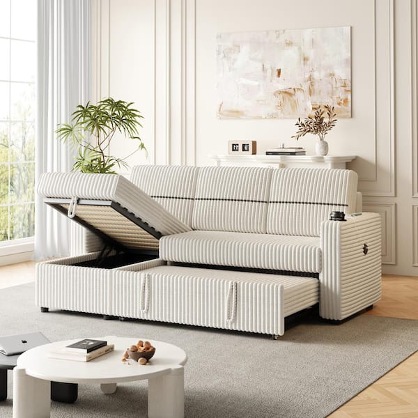 Beige 85 in. Corduroy Chenille 3 Seater Sofa Bed with Storage Chaise, Square Handrail, 2 Cup-holder and USB Charge Port