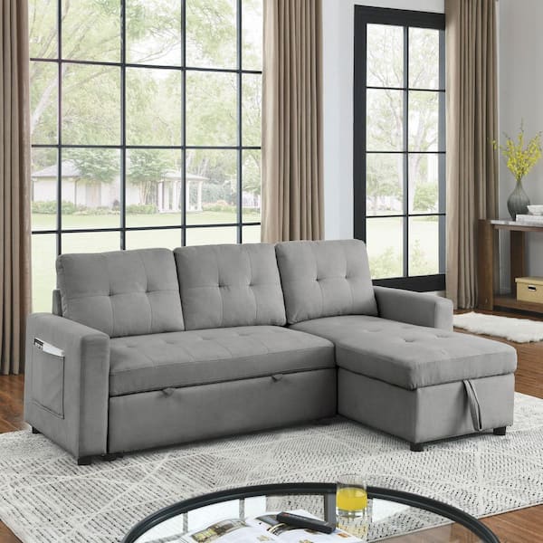 Grey 78.5 in. Reversible Polyester Full Size Sectional Sofa Bed with Storage Chaise and Side Pocket