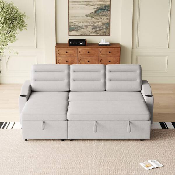 Light Grey 83.5" Convertible Polyester Sleeper Full Size Sofa Bed with Pullout Bed, Storage Recliner & Cup Holders