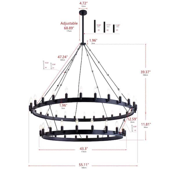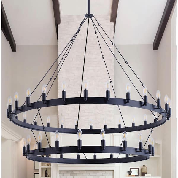 55.1 in. 48-Light Farmhouse Black 2-Tier Wagon Wheel Candle Chandelier Round Industrial Pendant Lighting