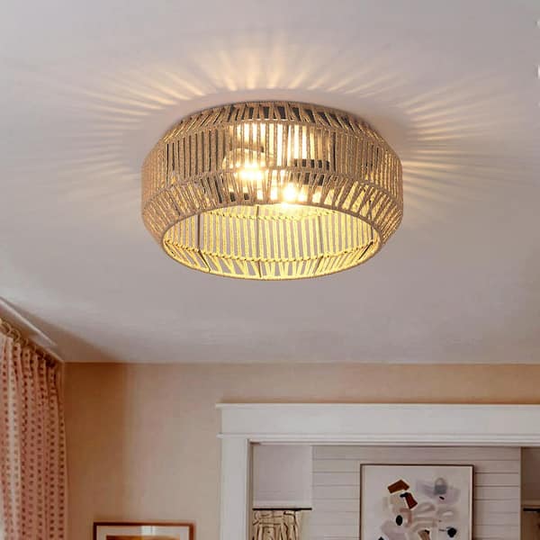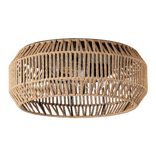 Farmhouse 15.55 in. 2-Light Rattan Flush Mount Ceiling Light Fixture with Hand-Woven Shade