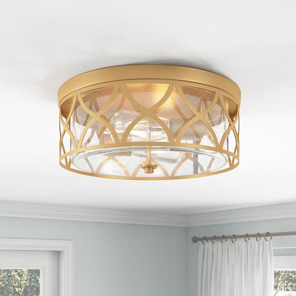 Industrial 13.77 in. 2-Light Gold Farmhouse Flush Mount Ceiling Light with Seeded Glass Shade