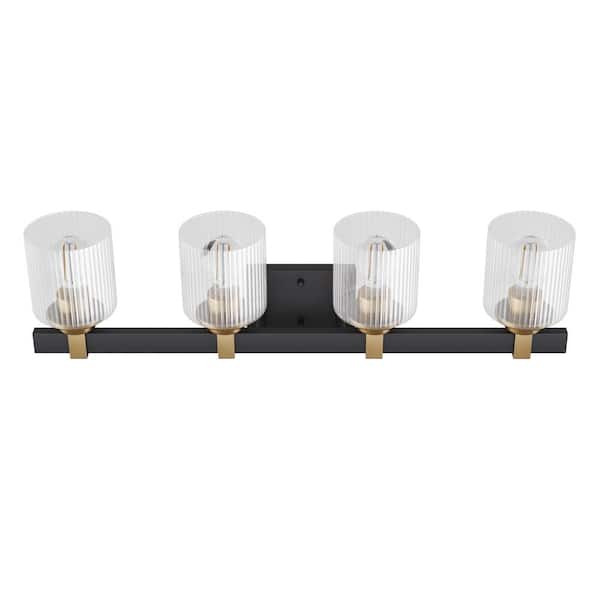 Modern 28.35 in. 4-Light Black and Gold Vanity Light with Texture Glass Shade