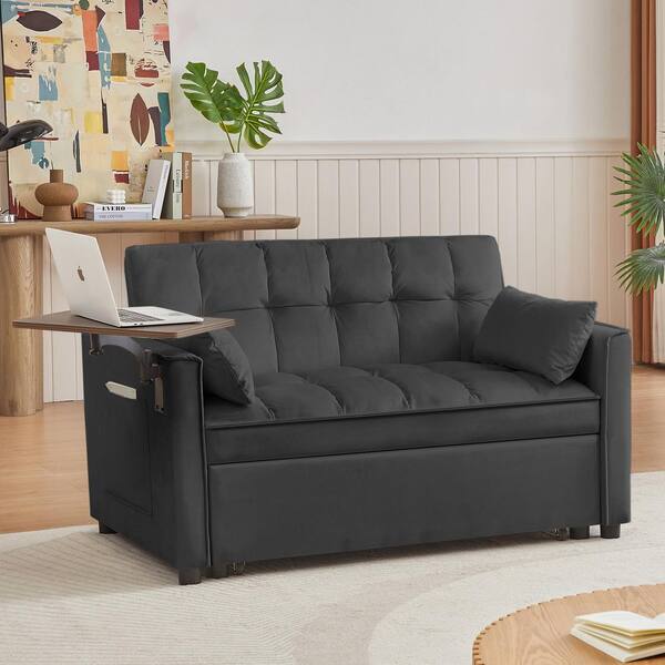 53 in. W 3-in-1 Convertible Velvet Sleeper Sofa Bed with 2 Pillows and Small Table, Black, 2-Seater Loveseat