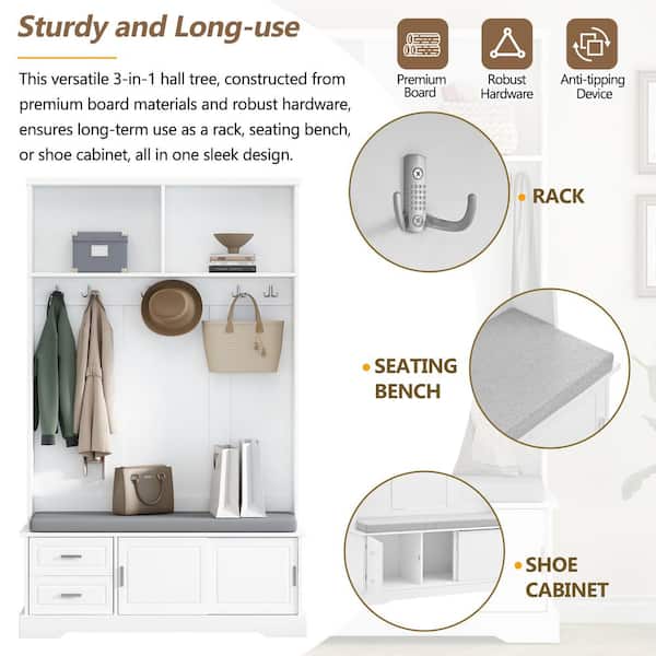 78.7 in. H x 47.2 in. W White Wood Shoe Storage Cabinet with 6 Hooks, 3-in-1 Versatile Hall Tree