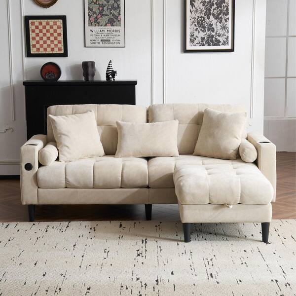 Modern 77.2 in. W Beige Chenille 2-Seater Loveseat with Ottoman and Charging Station