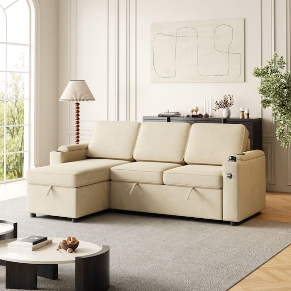 Modern 85.8 in. Beige Fabric Twin Size Sofa Bed with Storage and Charging Station