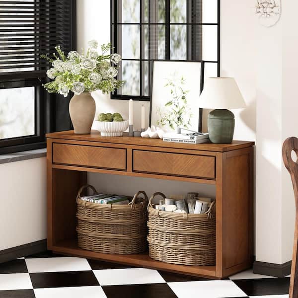 Rustic 55 in. Honey Rectangle Wood Console Table with Storage Drawers and Open Shelf