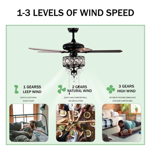 52 in. Smart Indoor Black Ceiling Fan with 3 Light Bulbs with Crystal Appearance and Hand Pull Chain
