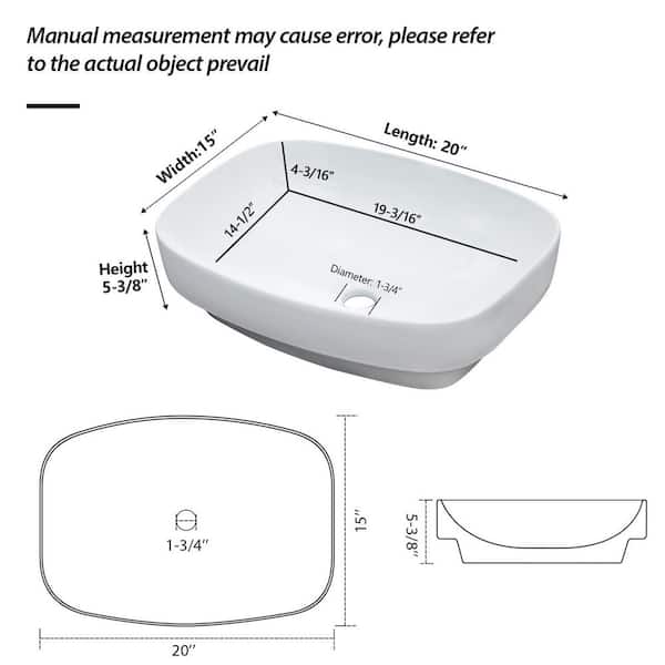 20 in. x 15 in. White Semi-Recessed Ceramic Rectangular Countertop Vessel Bathroom Sink