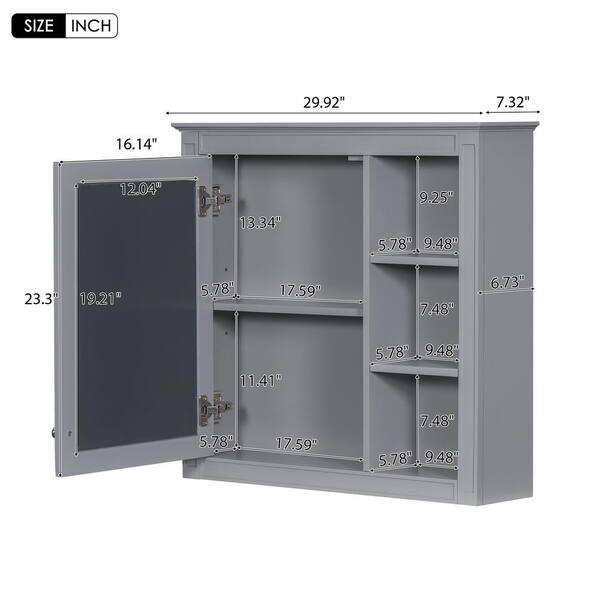 29.92 in. W x 28 in. H x 7.32 in. D Bathroom Storage Wall Cabinet in Gray with Mirror and 3 Open Shelves