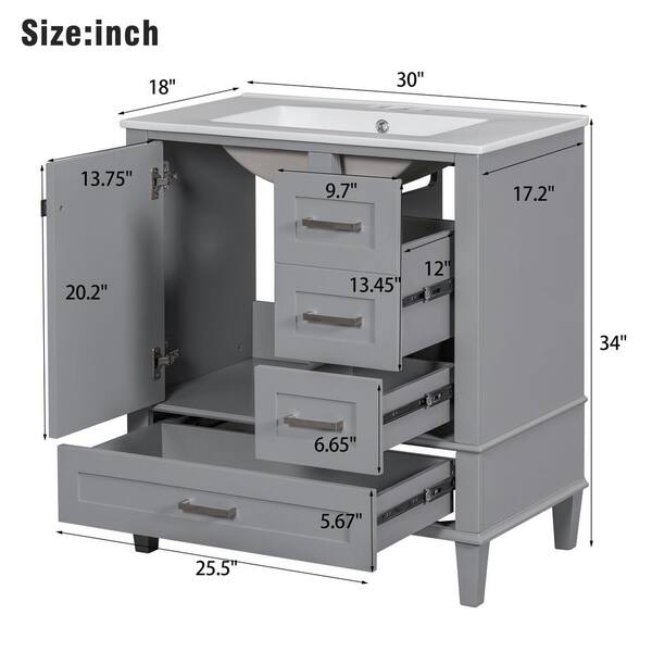 30 in. W x 18.3 in. D x 34 in. H Gray Bathroom Vanity with Single Sink and White Ceramic Top, 1-Door and 3-Drawers