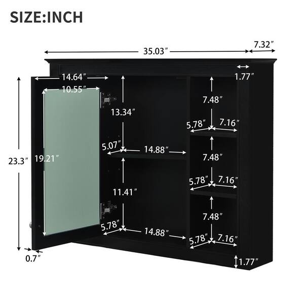 35.03 in. W x 7.32 in. D x 27.5 in. H Wall Mounted Bathroom Storage Cabinet in Black with Mirror and 6 Open Shelves