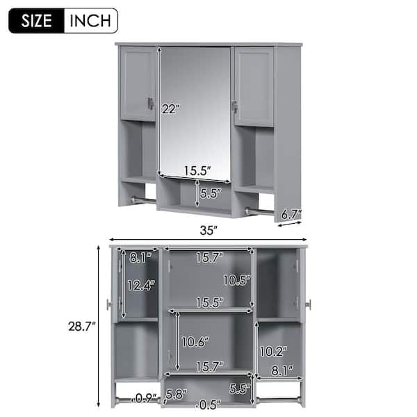 35 in. W x 28.7 in. H x 6.7 in. D Bathroom Storage Wall Cabinet in Gray with Mirror, Medicine Cabinet and Towels Bar