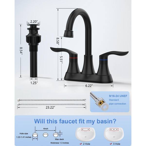 4 in. Centerset 2-Handle Bathroom Faucet with 360° High Arc Swivel Spout, Pop-up Drain and Supply Hoses, Matte Black