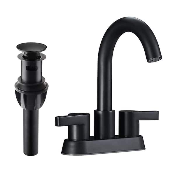 4 in. Centerset Double Handle High Arc Bathroom Faucet with Pop Up Drain Assembly, Matte Black