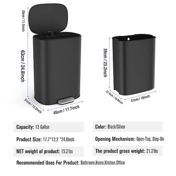 50L/13.2 Gal. Stainless Steel Soft-Close Kitchen/Bathroom Trash Can with Foot Pedal in Black