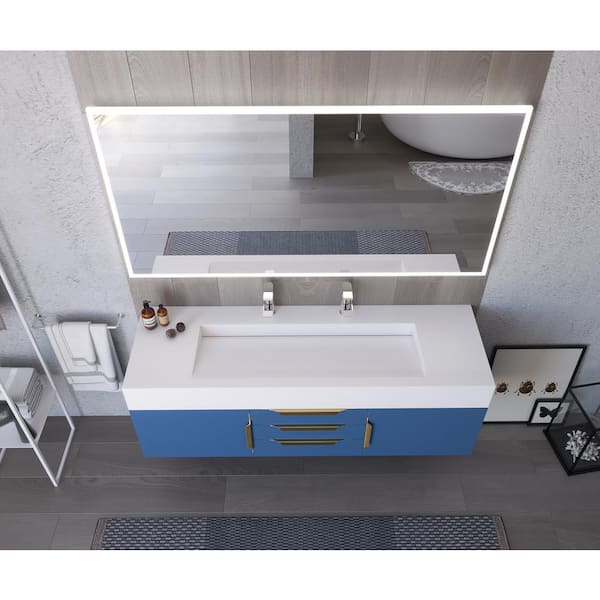 Nile 60 in. W x 19 in. D x 20 in. H Bath Vanity in Matte Blue with Gold Trim and White Solid Surface Top