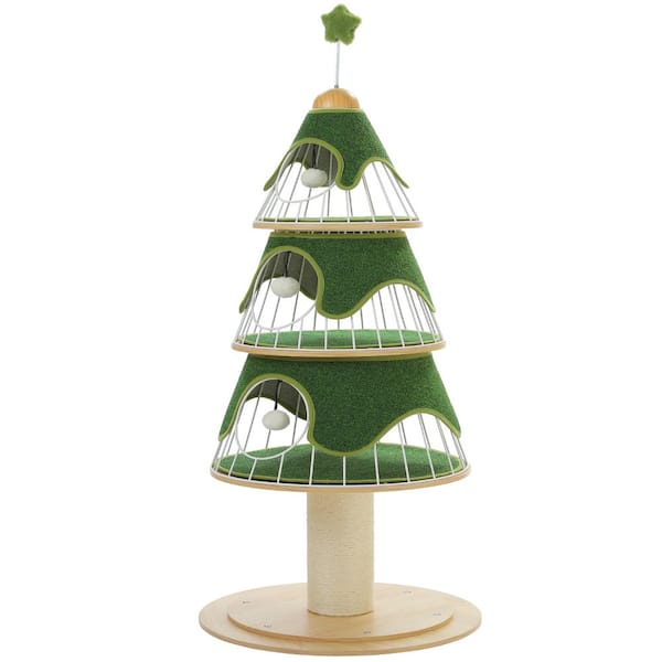 51.2 in. Tall Pine Shape Cat Tree Wood Thick Scratch Post Cat Condos Heavy Duty Cat Furniture for Small Cat in Green