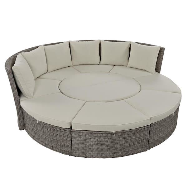 All-Weather PE Wicker Sunbed Daybed 5-Piece Round Rattan Outdoor Sectional Sofa Set with Gray Cushions