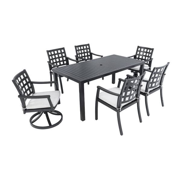 Black 7-Piece Aluminum Outdoor Dining Set with Grey Cushion /4 Dining Chairs+2 Swivel Rockers/67 in. Rectangle Table