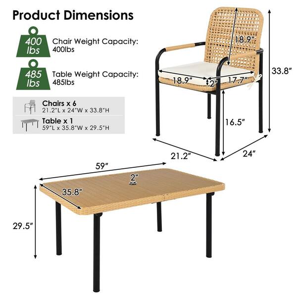 • Includes 1 patio table and 6 dining chairs with rattan backs