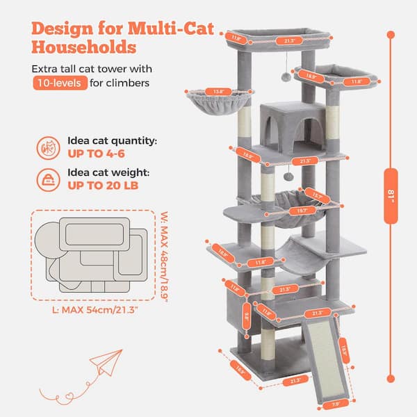 Grey Indoor Large Cat 81 in. Tall Multi-Level Cat Tree