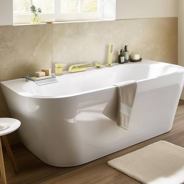 Single-Handle Tub Deck Mount Roman Tub Faucet with Hand Shower and Water Suply Hose in Brushed Gold