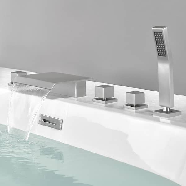 Single-Handle Tub Deck Mount Roman Tub Faucet with Hand Shower and Water Suply Hose in Brushed Nickel