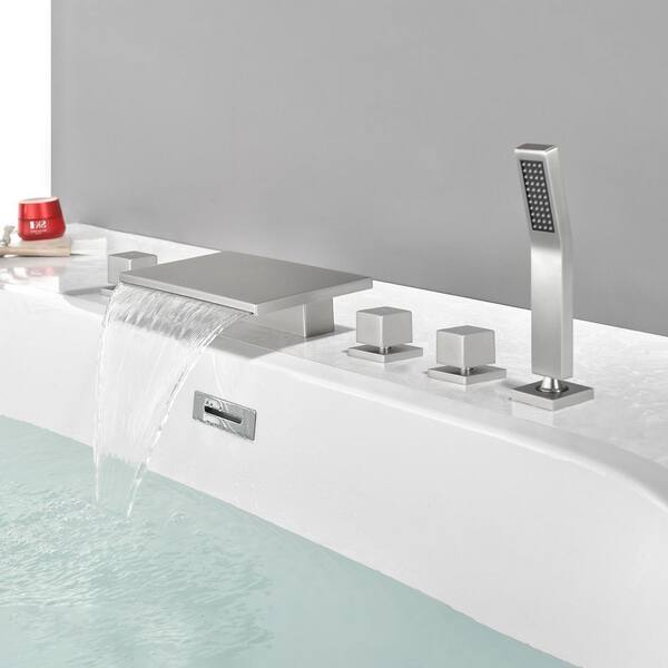 Single-Handle Tub Deck Mount Roman Tub Faucet with Hand Shower and Water Suply Hose in Brushed Nickel