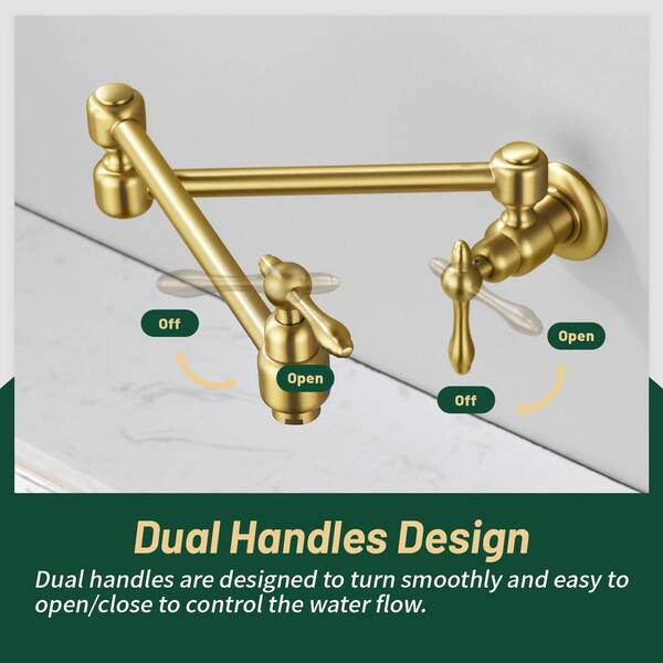 Wall Mounted Folding Pot Filler with Double-Handle Brass Stretchable Kitchen Sink Faucet in Brushed Gold