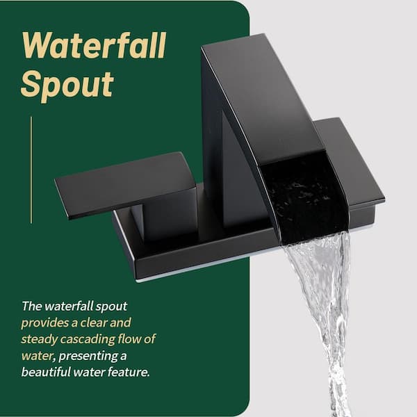 Waterfall Spout 304-Stainless Steel 4 in. Centerset Double Handle Bathroom Faucet with Drain Kit Included in Matte Black