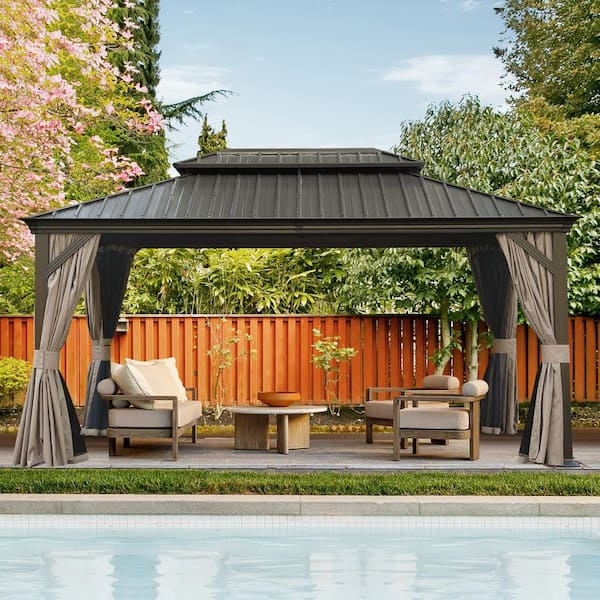 12 ft. x 16 ft. Brown Outdoor Hardtop Gazebo with Double Galvanized Steel Roof and Detachable Curtain and Netting