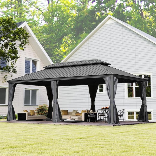 14 ft. x 24 ft. Galvanized Steel Hardtop Gazebo with Gutters and Mosquito Netting Gray
