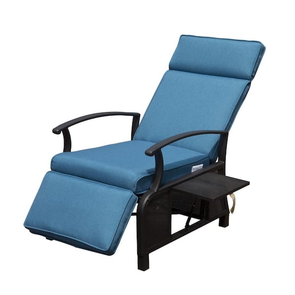 Metal Outdoor Recliner with Blue Cushion and Flip Table