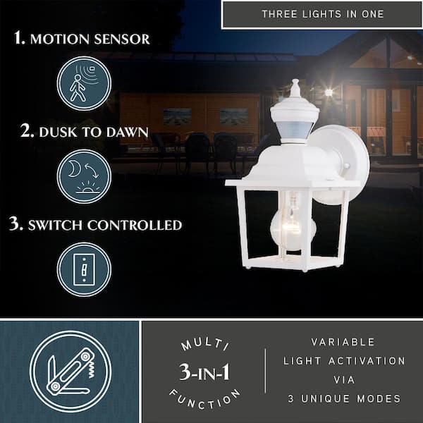 Bedford Aluminum 5.25 in. W 1-Light White Motion Sensor Dusk to Dawn Outdoor Wall Lantern Clear Glass