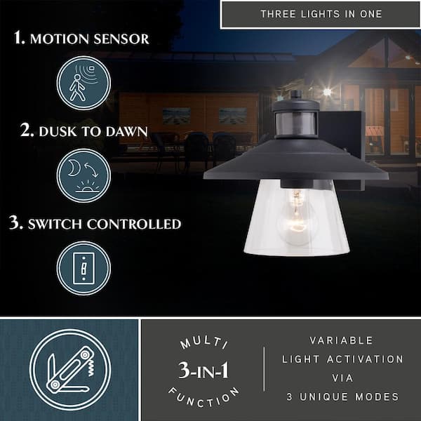 Westport Steel LED Compatible Black Motion Sensor Dusk to Dawn Outdoor Wall Light Coastal Clear Glass