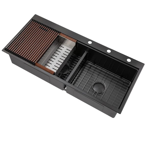 16-Gauge Nano Black Stainless Steel 48 in. Double Bowl 60/40 Offset Drop-In Workstation Kitchen Sink with Accessories