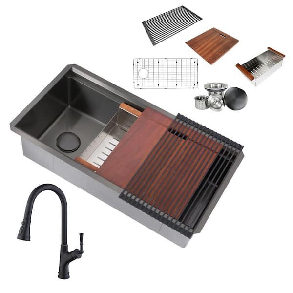 Stainless Steel Black 32 in. Single Bowl Undermount Workstation Kitchen Sink with Faucet