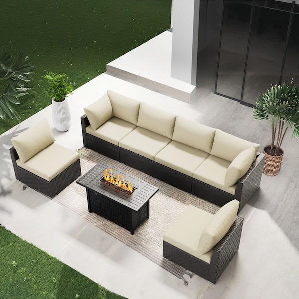 7-Piece Outdoor Patio Furniture Set Manual Weaving Wicker Patio Sofa with 43 in. fire pit Table and Beige Cushion