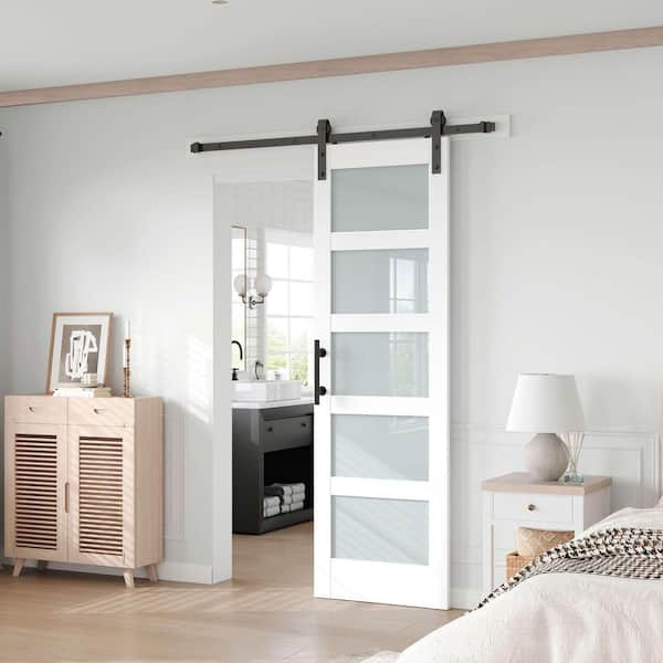 26 in. x 84 in. 5-Lite Frosted Glass White Finished MDF Sliding Barn Door with Hardware Kit
