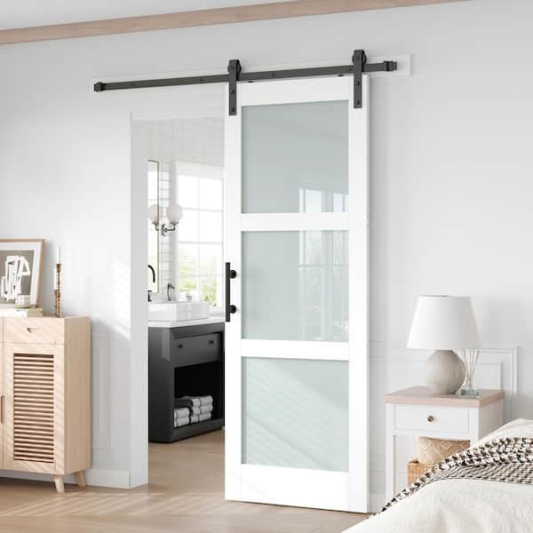 30 in. x 84 in. 3-Lite Frosted Glass White Finished MDF Core Sliding Barn Door with Hardware Kit