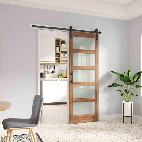 30 in. x 84 in. 5 Lite Frosted Glass Brown Finished MDF Sliding Barn Door with Hardware Kit