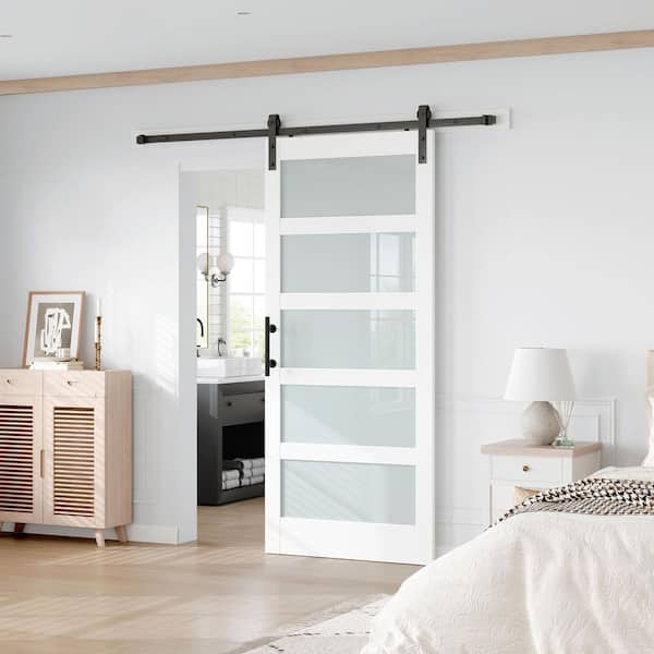 34 in. x 84 in. 5-Lite Frosted Glass White Finished MDF Sliding Barn Door with Hardware Kit