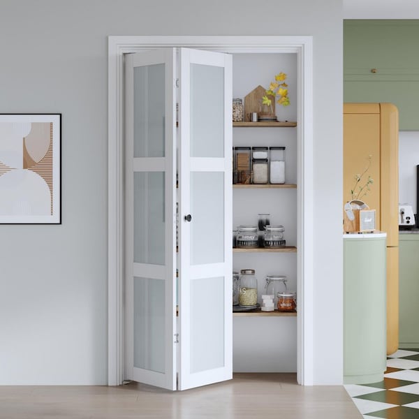 42 in. x 80 in. 3 Lite Frosted Glass White Finished Solid MDF Bi-Fold Door with Hardware Kit