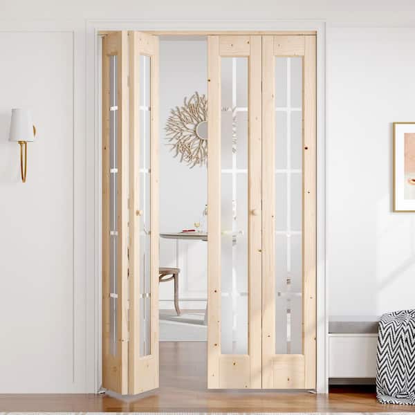 48 in. x 80 in. 3/4 Lite Frosted Glass Preassembled Solid Core Wood Spruce Bi-fold Door with Hardware
