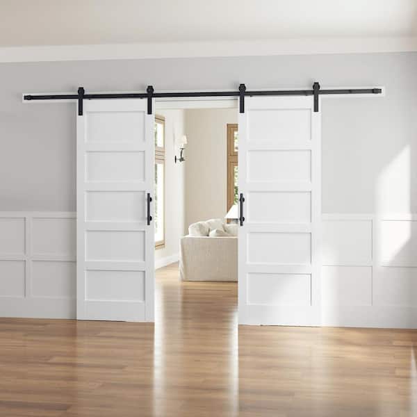 60 in. x 84 in. (Double 30 in. Doors) 5-Panel Solid MDF White Finished Interior Sliding Barn Door with Hardware Kit
